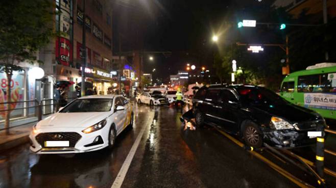 오늘(23일) 밤 9시쯤 서울 성동구 행당동의 한 도로에서 차량 4대가 잇따라 부딪혀 5명이 다치는 사고가 발생했습니다.