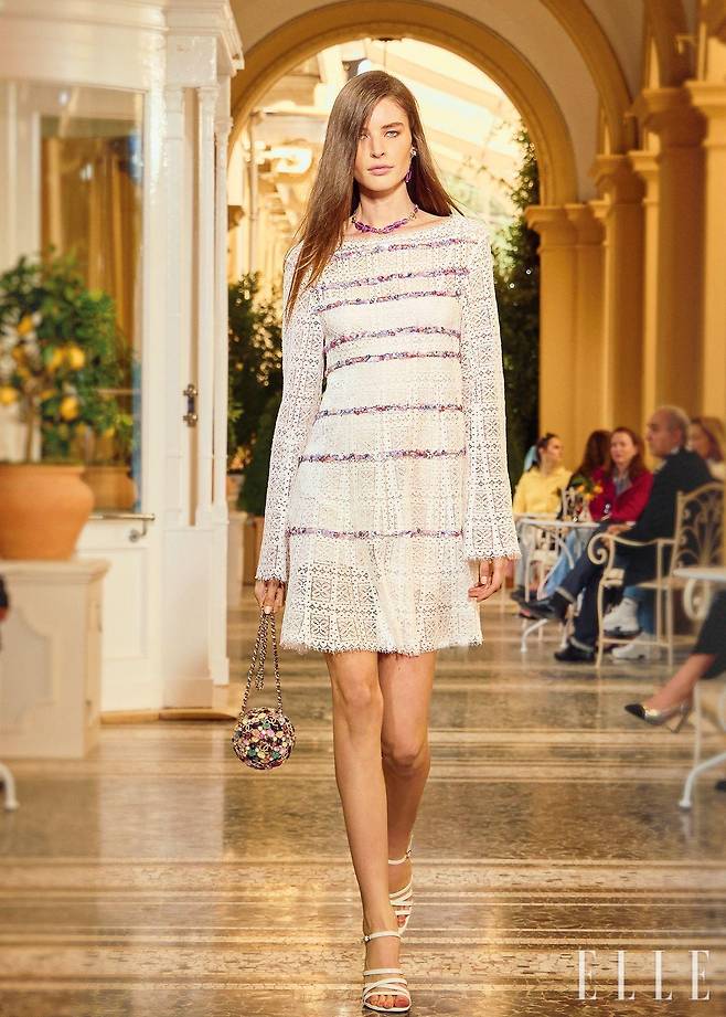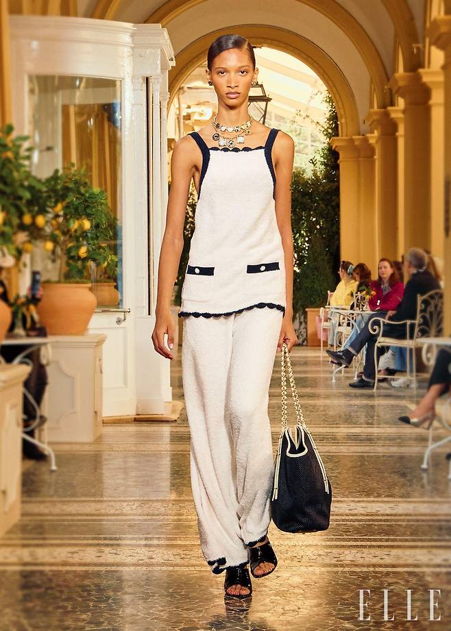 드디어 크루즈 컬렉션 쇼의 아침이 밝았다. 이번 쇼는 호텔 라이프에서 영감을 받아 이탈리아 휴양지에서 보내는 휴가를 주제로 한다. 장소와 테마가 얼마나 완벽하게 어우러지는 서사인지. 쇼에 대한 기대감은 한층 더 높아졌다. 첫 번째 샤넬 걸이 계단을 여유롭게 걸어 내려와 회전문을 밀고 우아하게 등장하면서 런웨이가 시작됐다. 컬렉션을 대표하는 첫 번째 룩은 휴양지에서 가운을 걸치고 아침을 맞이하는 배우를 보는 듯했다. 볼드한 선글라스에 진주 장식의 체인 네크리스 그리고 새하얀 플라운스 장식의 태피터 볼가운을 매칭해 빌라 데스테와 완벽한 조화를 이뤘다. 외부 세계와 격리된 아름다운 섬에서 본격적으로 휴가를 즐기는 모멘트를 포착한 크리에이션 스튜디오는 명민하게 화려하고 여유로운 호텔 라이프를 보여줬다.