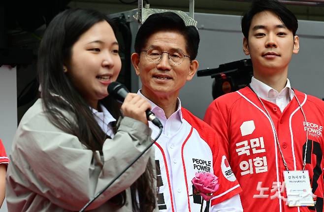 김문수 국민의힘 대선 후보가 19일 오전 서울 중구 청계광장에서 '청년이 바라는 대한민국' 정책 공약을 발표를 앞두고 청년들의 발언을 듣고 있다. 황진환 기자