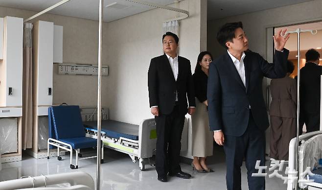 개혁신당 이준석 대선 후보가 21일 오후 경기 성남시의료원을 방문해 간담회를 마치고 천하람 원내대표, 이주영 의원과 의료원 내 빈 병상을 둘러보고 있다. 윤창원 기자