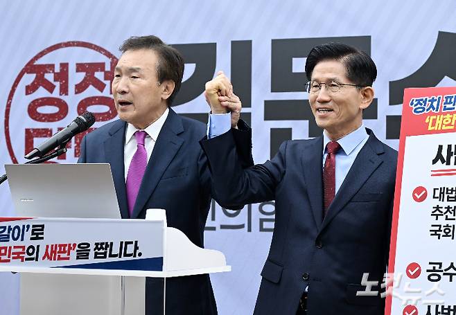 국민의힘 김문수 대선후보가 19일 오후 서울역광장에 마련된 유세차량에 올라 가수 김흥국의 손을 맞잡고 있다. 황진환 기자