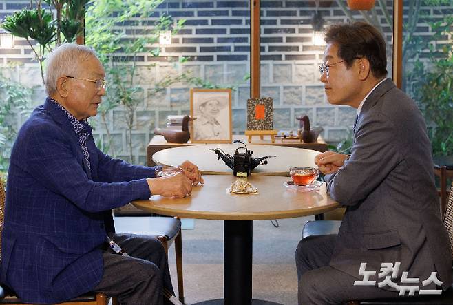 더불어민주당 이재명 대선 후보와 송기인 신부가 22일 오후 경남 양산시 소소서원에서 차담을 나누고 있다. 양산=류영주 기자