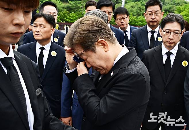 이재명 더불어민주당 대선 후보가 23일 오전 김해시 봉하마을 고 노무현 전 대통령 묘역을 찾아 참배를 마친 뒤 눈물을 닦고 있다. 봉하=류영주 기자
