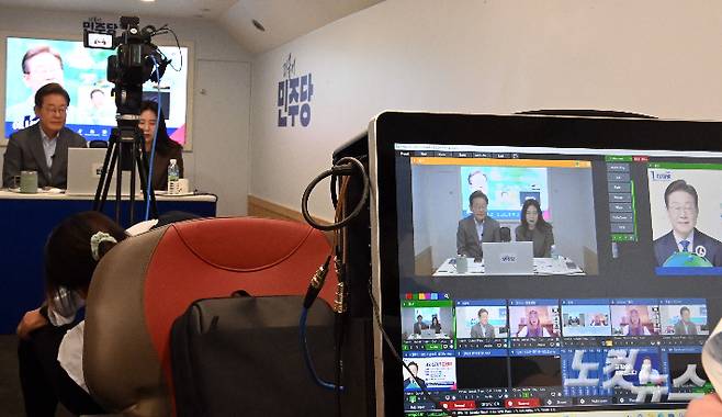 제21대 대통령선거 재외국민투표가 시작된 20일 오전 이재명더불어민주당 대선후보가 경기 의정부시 유세를 앞두고 버스에서 재외국민투표독려를 위한 'K-이니셔TV'로 전세계 재외동포를 연결한 줌방송을하고 있다. 류영주 기자