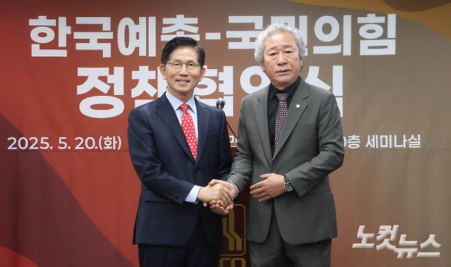 국민의힘 김문수 대선 후보가 20일 오전 서울 양천구 대한민국예술인센터에서 열린 한국예총·국민의힘 정책협약식에 참석해 한국예총 조강훈 회장과 악수하고 있다. 황진환 기자