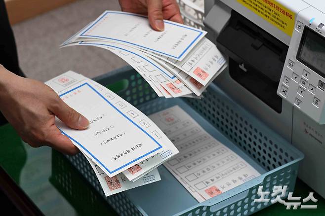 21일 서울 양천구 양천구선관위에서 선관위 관계자들이 21대 대통령 선거 '거소투표용지'를 인쇄하고 있다. 거소투표는 함정에서 오랫동안 생활하는 군인 등 투표소와 멀리 떨어져 직접 투표가 곤란한 유권자 392명을 위한 투표 방법이다. 박종민 기자