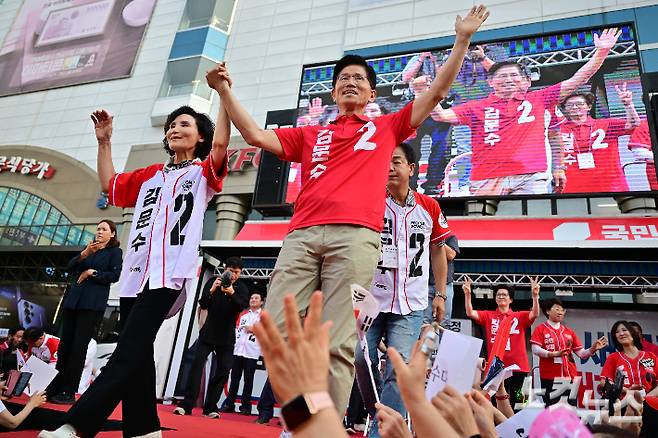 김문수 국민의힘 대선 후보와 배우자 설난영 여사가 22일 경기 부천시 부천역마루광장에서 열린 집중유세에서 시민들에게 인사를 하고 있다. 황진환 기자