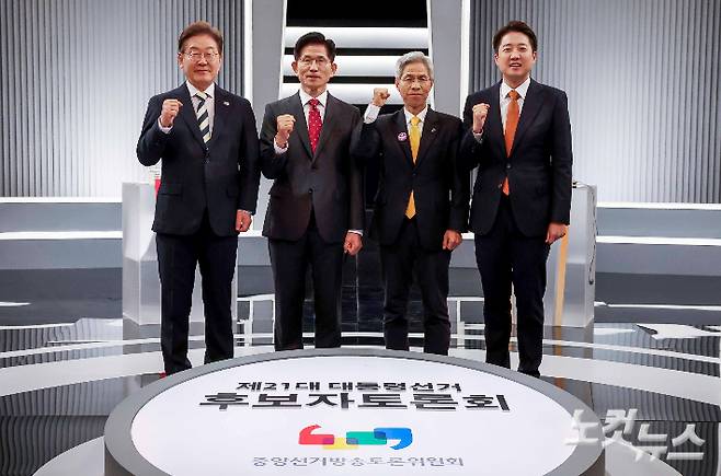 23일 서울 영등포구 여의도 KBS 스튜디오에서 열린 중앙선거방송토론위원회 주관 제21대 대통령선거 후보자 토론회에 앞서 더불어민주당 이재명(왼쪽부터), 국민의힘 김문수, 민주노동당 권영국, 개혁신당 이준석 대선후보가 기념촬영을 하고 있다. 국회사진기자단