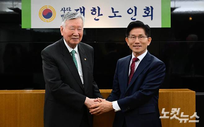 이재명 더불어민주당 대선 후보가 19일 오전 서울 용산구 대한노인회중앙회를 방문해 이중근 대한노인회장과 인사하고 있다. 류영주 기자