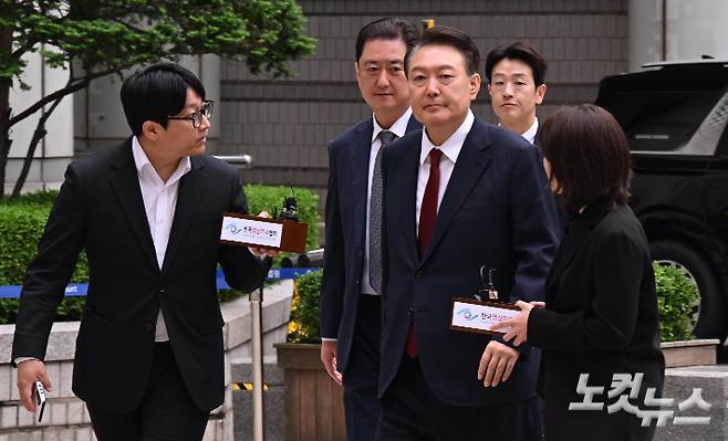 윤석열 전 대통령이 19일 오전 서울 서초구 중앙지방법원에서 열린 내란 우두머리 혐의, 직권남용 권리행사방해 혐의 사건 4차 공판에 출석, 취재진의 질문을 받으며 이동하고 있다. 사진공동취재단