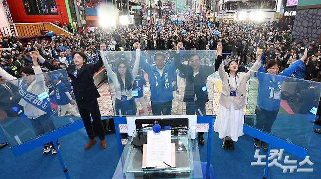 이재명 더불어민주당 대선 후보가 19일 오후 서울 용산역 광장에서 열린 집중유세에 참석해 방탄유리가 설치된 유세차 위에서 지지를 호소하고 있다. 류영주 기자