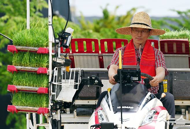국민의힘 김문수 대선후보가 21일 오후 경기 고양시 덕양구 화정동 일대 논에서 청년농업인과 이앙기에 탑승해 모내기를 하고 있다. 황진환 기자