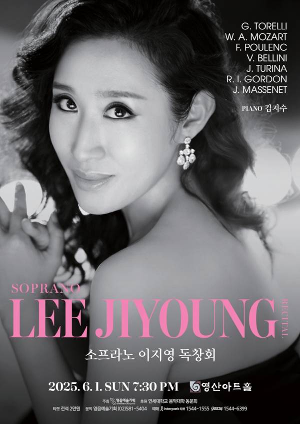 소프라노 이지영이 6월 1일 서울 영등포구 영산아트홀에서 독창회(포스터)를 연다. 이지영은 연세대를 거쳐 미국 오클라호마 시티대 음악대학원 석사와 바드대 론지 음악학교 오페라 디플로마를 졸업했다. 그는 워싱턴 국립오페라단에서 ‘도밍고-카프리츠 영 아티스트’를 거쳐 ‘마술피리’ ‘리골레토’ 등 다양한 작품에서 주역을 맡았다. 또 뉴욕 메트로폴리탄 오페라단, 뉴욕시티오페라단, 톨레도 오페라단 등의 공연에도 캐스팅됐다. 워싱턴 국립오페라단 50주년 갈라 콘서트를 비롯해 미국과 유럽에서 모차르트 ‘레퀴엠’과 베토벤 교향곡 9번 ‘합창’의 솔리스트 등 다양한 콘서트에 출연했다. 이번 독창회는 피아니스트 김지수와 함께 모차르트, 풀랑 벨리니, 마스네 등 다양한 작곡가의 성악곡을 들려준다. 문의 영음예술기획(02-581-5404)
