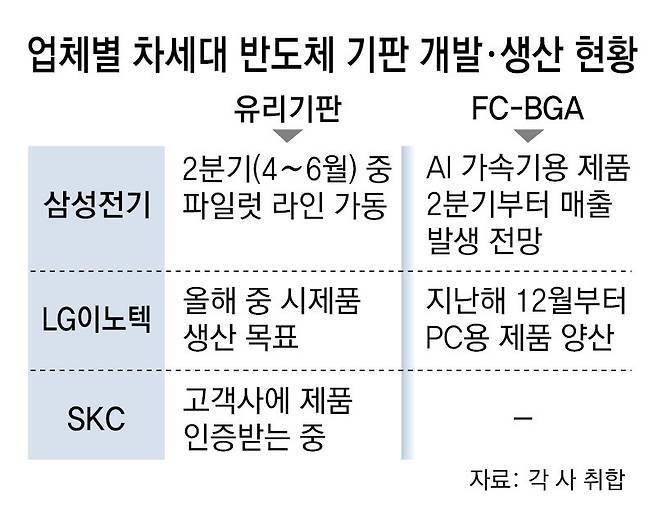 삼성전기는 2분기(4∼6월)부터 세종사업장에서 유리기판 파일럿 라인을 가동할 예정이다. 시제품을 생산해 빅테크 업체 대상 고객사 모집에 나설 계획이다. 유리기판 사업에 상대적으로 늦게 뛰어든 LG이노텍은 올해 말쯤 시제품 생산에 나서는 것을 목표로 하고 있다.