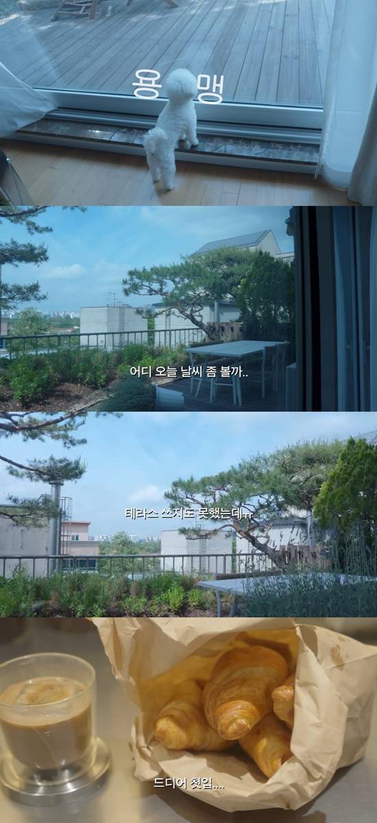 이날 강민경은 아침에 일어나자마자 커튼을 치고 날씨를 확인했다. 나무들로 잘 꾸민 조경이 인상적인 넓은 테라스에는 밖에서 식사 등을 즐길 수 있도록 테이블도 있었다.