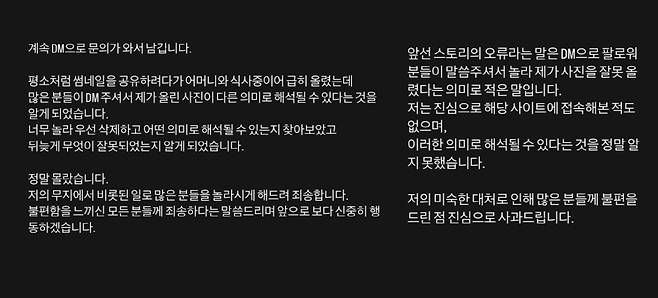 식사 도중이었기에 단순하게 뒤집어서 올리면 얼굴이 제대로 안보이겠지'라 고 생각하고 섬네일을 뒤집어서 업로드했습니다. 이후 팔로워분이 디엠으로 오해를 불러 일으킬 만한 사진이라고 알려주셔서, 바로 삭제하고 제대로 된 사 진으로 업로드 했습니다.