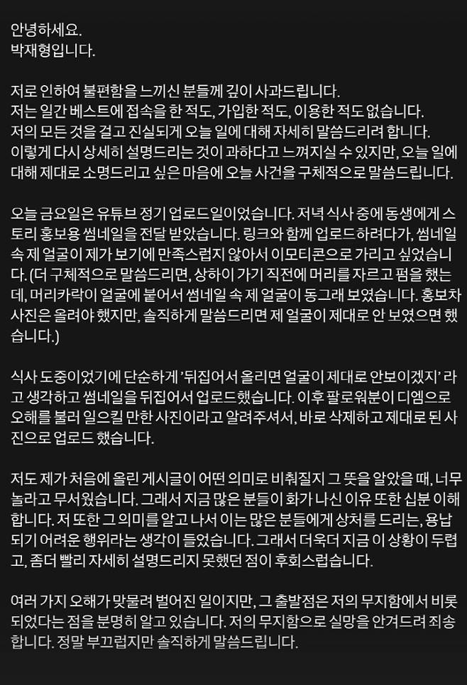 재형은 논란이 된 SNS 업로드 상황에 대해 "오늘 금요일은 유튜브 정기 업로드 일이었다. 저녁 식사 중에 동생에게 스토리 홍보용 섬네일을 전달 받았다. 링크와 함께 업로드하려다가, 섬네일 속 제 얼굴이 제가 보기에 만족스럽지 않아서 이모티콘으로 가리고 싶었다"고 설명했다.