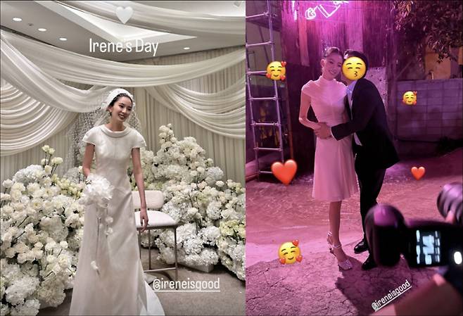 23일 결혼식 당일에는 순백의 웨딩드레스로 우아함을 드러냈다. 동료 모델 이현이는 신부 대기실에서 하객들을 맞이하는 아이린의 모습을 공개했다. 아이린은 독특한 망사 베일로 모델 다운 소화력을 뽐냈다. 핫했던 전날 파티와는 확연히 다른 분위기가 돋보인다.