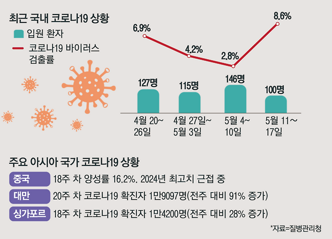 같은 기간 대만에선 코로나19로 인한 외래·응급실 방문자가 1만9097명으로 직전 주 대비 91.3% 늘었다. 중국 역시 18주 차 기준 코로나19 양성률이 16.2%로 지난해 최고치에 근접하는 등 코로나19가 빠르게 확산하고 있다.