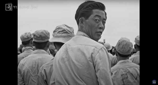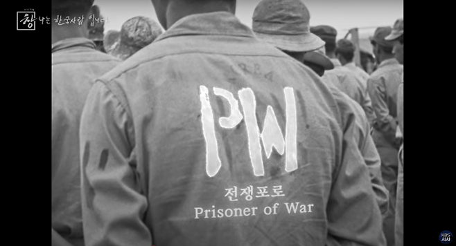 미군이 촬영한 하와이 포로수용소의 실제 영상. 아무런 표식이 없는 군복에 전쟁포로라는 뜻의 PW가 적혀 있고, 손으로 직접 적어 넣은 듯한 KOREA.