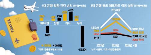 하나은행도 인천공항에 들어가 있긴 하지만 외환은행을 인수·합병해 외환시장에서 워낙 입지가 강한 데다 트래블카드 선두주자라 상대적으로 느긋한 편이다. 하나은행은 외환 분야에서 2023년 3250억원, 2024년 4155억원의 수익을 냈다. 인천공항 입찰에서 탈락한 신한은행은 2023년 888억원에 불과했던 외환손익이 2024년 1368억원으로 올라가며 증가율로 가장 좋은 성적을 내는 ‘반전’을 맞이했다.