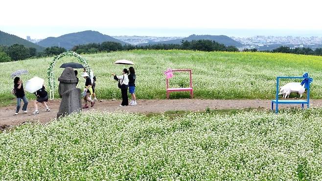 [비가 내리기 시작한 21일 오전 제주시 오라이동 중산간의 메밀밭을 찾은 관광객이 활짝 핀 메밀꽃을 즐기고 있다. (사진=연합뉴스)]