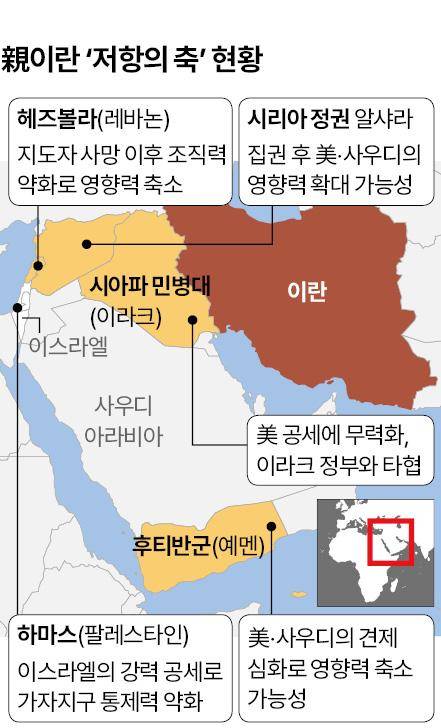 근래 중동 지역의 세력 관계 변화에서 사우디의 부상 못지않은 건 이란의 쇠락이다. 2023년 하마스의 이스라엘 공격 이후 다발적인 무력충돌 과정에서 이란 군사력의 실상이 일부 드러났다. 특히 지난해와 올해 연이은 ‘저항의 축’ 지도자들의 사망은 이란의 전략적 입지를 크게 약화시켰다. 역내 주적으로 삼아온 이스라엘과는 전면전 대신 주변 우호세력을 앞세운 대리전을 펼쳐온 만큼 사실상 군사적 기반을 상실한 셈이기 때문이다.