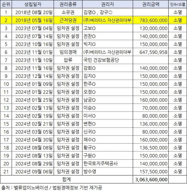 해당 부동산의 현재 소유자는 강규○(1962년생), 김영○(1967년생)으로, 각각 1/2 지분을 소유하고 있습니다. 두 사람은 2018년 4월 17일, 매매를 통해 토지 및 건물을 공동 취득하였습니다. 소유권 이전 등기 이후 가장 먼저 설정된 권리는 2018년 5월 16일, ㈜베리타스 자산관리 대부가 설정한 근저당권 783,600,000원(약 7억8360만원)입니다. 이 근저당권이 해당 부동산의 '말소기준권리'로 작용합니다. 따라서 경매가 진행될 경우, 이 근저당권보다 후순위로 설정된 모든 권리(가압류, 압류, 추가 근저당권 등)는 원칙적으로 말소됩니다. 이 말소기준권리를 기준으로 설정된, 후순위 권리 내역은 다음과 같습니다.
