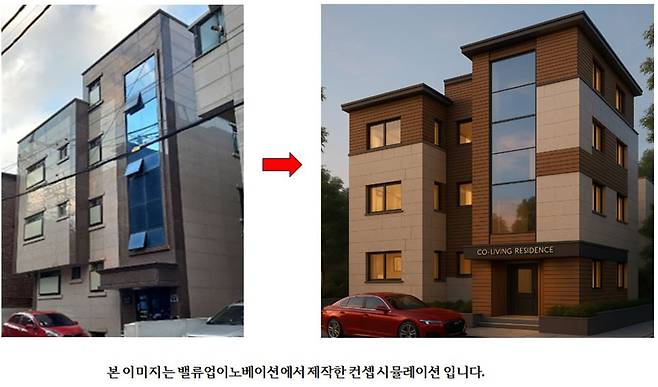 1층 전면부에는 'CO-LIVING RESIDENCE'라는 사인보드를 설치하여, 이 건물이 셰어하우스와 같은 신개념 주거 상품임을 직관적으로 전달하고 있습니다. 이는 단순한 외관 개선을 넘어, 건물의 용도와 콘셉트 자체를 브랜딩 하려는 시도로 해석할 수 있습니다.
