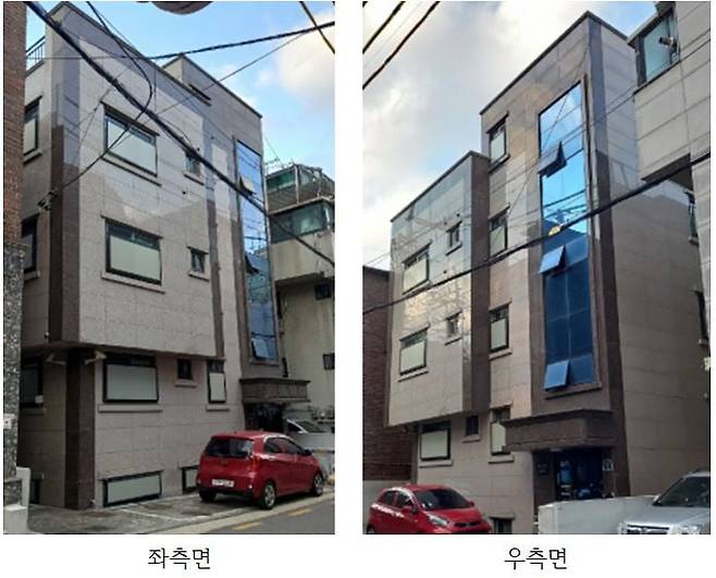 기존 건물의 외벽은 전체적으로 연마된 화강석 석재로 마감되어, 전통적이고 중후한 인상을 주는 입면을 형성하고 있습니다. 전면 중앙에는 세로형 유리창이 강조되어 있어, 건물의 수직 축을 시각적으로 분할하며 외관에 일정한 리듬감을 부여합니다. 그러나 이 유리창은 주변 석재 마감과의 조화보다는 비례감 측면에서 다소 어색하게 느껴질 수 있습니다. 전반적으로 중후한 분위기를 강조한 외관이지만, 현재 시장의 트렌드나 주요 수요층의 선호도와는 맞지 않는 구식 이미지로 인식될 가능성이 있습니다.