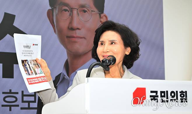 | ▲ 국민의힘 김문수 대선후보 부인 설난영 여사가 21일 서울 여의도 중앙당사에서 열린 함께 하는 정정당당 여성본부 필승결의대회에서 축사를 하며, 자신의 결혼식 사진이 실린 국민의힘 부부의날 홍보물을 들고 있다. 설난영 여사는 "제 실물이 더 낫지요. 아니 못난이 사진만 여기다 해놨어. 아 정말. 제가 제일 못났다고 생각하는 사진을 여기다 이렇게... 아 정말 너무해요"라고 말했다. |
