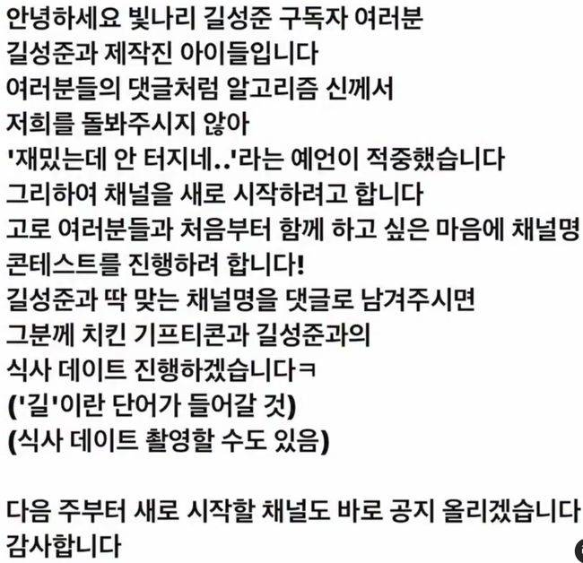 또한 길은 "새로 시작할 채널도 바로 공지 올리겠습니다"라며 "#알고리즘 #예능신이여도와주소서"라고 해시태그를 덧붙였다.