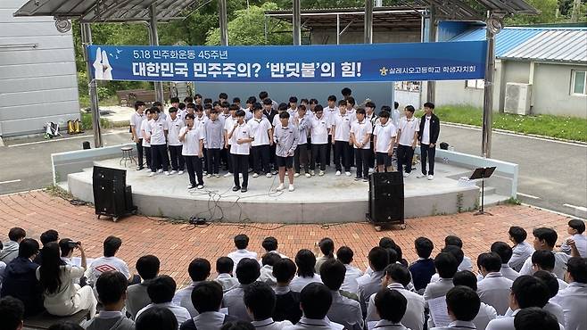 이어진 노래 '이 산하에'도 감동적이었다. 1990년대를 대표하는 민중가요 그룹 '노래를 찾는 사람들'의 곡으로, 한 지상파 방송의 5.18 40주년 행사 때 불리기도 했다. 이 곡은 대학 시절 노래패를 이끈 경험이 있는 학년 부장 교사가 비장한 목소리로 소화해 냈다. 주위로부터 음악 교사로 곧잘 오해되는 그는 기실 수학 교사다.