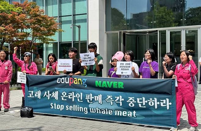 지난 22일 서울 송파구 쿠팡 본사 앞에서 고래고기 온라인 유통을 중단하라는 다소 생소한 기자회견이 열렸다.