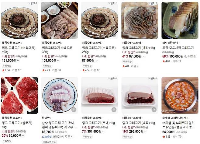 | ▲ 네이버 스토어에서 쉽게 검색되는 고래 고기들. 수육과 내장 심지어 고래부대찌게까지 종류도 다양하다. |