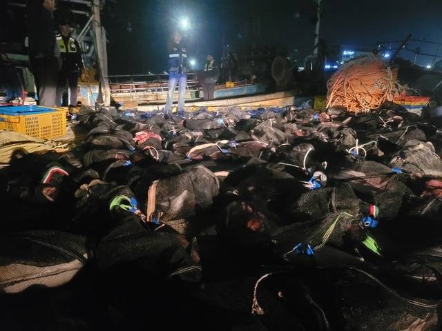 | ▲ 지난 7일 고래를 불법으로 포획 및 운반하던 일당이 구속된 모습. |