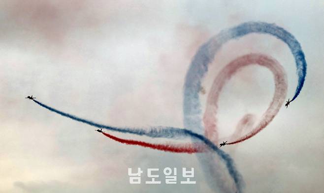블랙이글스의 멋진 에어쇼24일 광주광역시 광산구 공군 제1전투비행단에서 열린 '스페이스 챌린지 2025 in 광주'에서 공군 특수비행팀 블랙이글스가 곡예비행을 하고 있다. /임문철 기자 35mm@namdonews.com