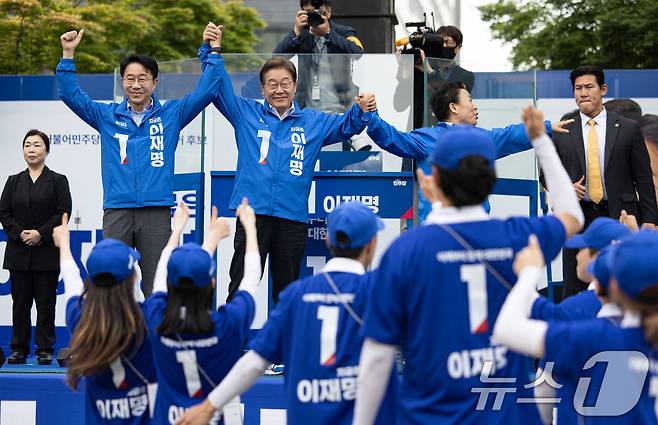 (시흥=뉴스1) 이재명 기자 = 이재명 더불어민주당 대통령 후보가 24일 오후 경기도 시흥시 배곧아브뉴프랑센트럴광장에서 열린 유세에서 손을 맞잡아 들어올리고 있다. 2025.5.24/뉴스1