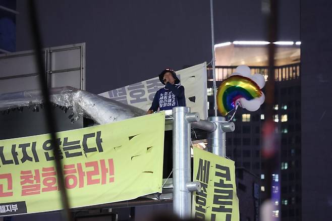 세종호텔 앞 '고공승리텐트'... "두려움 없이 맞서서 싸울 수 있었다"