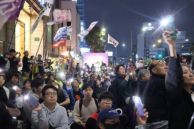 가로등과 상가의 조명이 밝혀지는 어두워진 퇴근길 도롯가에 많은 사람들이 모여 '정리해고 철회'를 외치는 노동자를 응원하는 구호와 노래를 이어갔다.