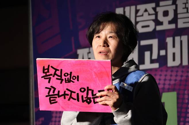 | ▲ 김란희 관광레저산업노조 세종호텔지부 조합원은 비록 세종호텔 소유주 주명건이 호텔을 비롯한 세종 재단의 모든 부와 권력을 쥐었다고 하지만, 한계가 없는 노동자·시민들의 연대의 힘이 있기에 두려움 없이 투쟁하고 있다고 전했다. |
