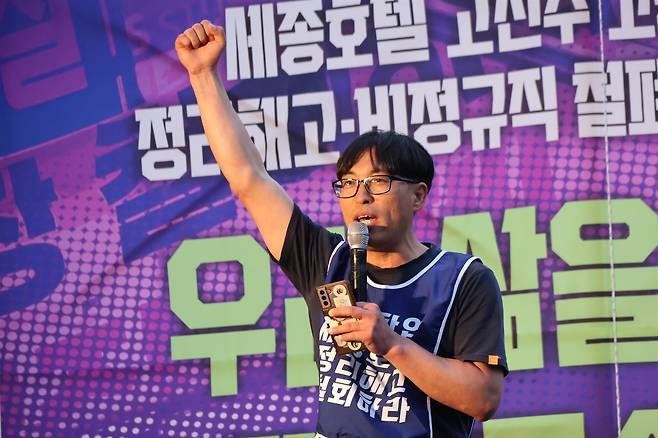 | ▲ 이청우 세종호텔 정리해고 철회 공동대책위원회 집행위원장은 정리해고법이 세종호텔 노동자들을 부당한 해고로 내몰았다고 지적하며, 투쟁으로써 노동자들의 원직 복직을 이뤄내야 한다고 호소했다. |