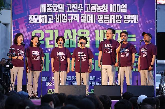 호텔 앞에 빼곡하게 채운 노동자·시민들은 세종호텔에서 정리해고 당하고 원직 복직을 위한 대법원까지의 법률소송에서 패소했으나 함께 해직당한 동료들을 위해, 그리고 자신과 비슷한 처지에 놓인 노동자들을 위해 해고당했던 직장 앞 지하차도 교통시설 구조물에 오른 고진수 관광레저산업노조 세종호텔지부장에게 연대의 함성을 보냈다.