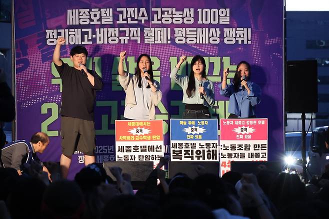 정리해고 당사자인 김란희 조합원은 "주명건은 세종호텔과 세종대학교를 포함한 세종 재단을 탐내 부모와 형제를 배신하고 쫓아내 모든 부와 명예를 움켜쥐었다고 생각하겠지만, 그 과정에서 해고당한 노동자들은 비록 거리에서 쫓겨났을지언정 아무런 이유와 조건도 없이 언제나 달려와 함께 연대해 주는 동지가 있기에 사측의 횡포에 언제나 두려움 없이 맞서서 싸울 수 있었다"고 연대의 손길을 내밀어준 참석자들에게 고마움을 전했다.