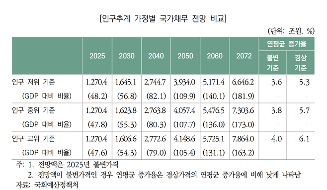 국회예산정책처가 올해 2월 ‘2025-2072년 장기재정전망’ 보고서를 발간했습니다. 해당 결과는 충격적입니다.