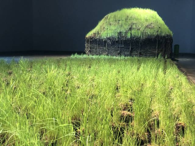 또한 작가는 전시장에 흙을 뿌리고 모종을 심기도 한다. 전시 기간 내내 물을 주고 돌보며 볍씨를 키운다. 이 같은 농사 흉내 내기를 통해, 그는 '생태적이고 윤리적인 노동', '생명을 이롭게 하는 예술'이라는 메시지를 전한다.