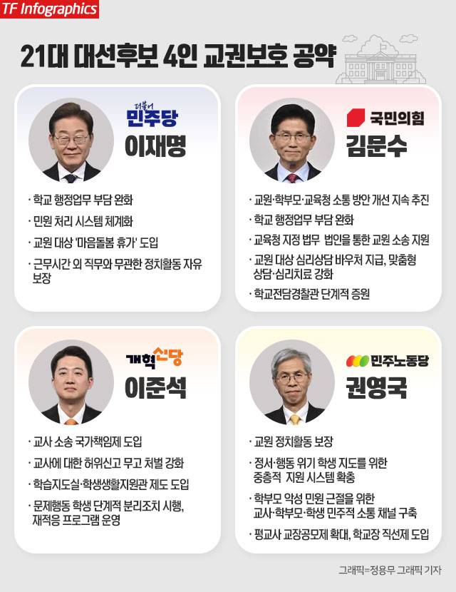 [더팩트ㅣ조채원 기자] 21대 대통령 선거 주요 대선 후보들이 교사의 정당한 교육활동을 보장하기 위한 제도 개선책을 경쟁적으로 내놓고 있다. 더불어민주당, 국민의힘, 개혁신당, 민주노동당 모두 '교권 보호'를 교육 공약으로 제시했다. 심각한 교권 침해가 교원 이탈, 교사 지원자 감소라는 악순환을 초래한다는 문제의식을 대선 공약에 적극 반영한 모습이다.