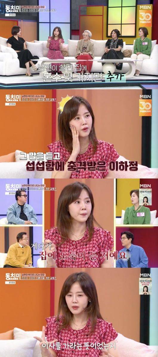 이하정은 “그때 또 도둑이 들었다. 이사를 가라는 뜻이었는지. 예물을 3인조 도둑이 들어서 다 가져갔다. 그 집에 있기가 싫었다. 너무 무서웠다. 저는 9시 뉴스를 진행할 때였다. 집이 비는 시간을 알더라. 이사를 나오면서 그제야 새 집에서 신혼 같은 생활을 했다”라고 덧붙였다.