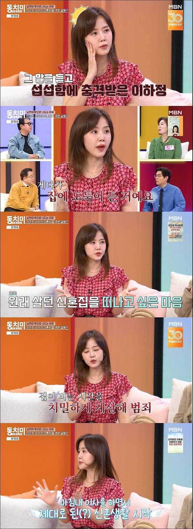 이하정은 "게다가 집에 도둑이 들었다"며 "이사를 가라는 뜻이었는지. 결혼 예물이니 뭐니 3인조 도둑이 들어서 다 가져갔다. 그 집에 있기가 싫었다. 너무 무서웠고 그때 저는 9시 뉴스르 진행할 때라 (도둑들이) 집이 비는 시간을 다 파악한 거다. 그래서 새 집에서 제대로 된 신혼 생활을 시작했다. 그 다음부터 그 얘기를 안 하더라"라고 밝혔다.