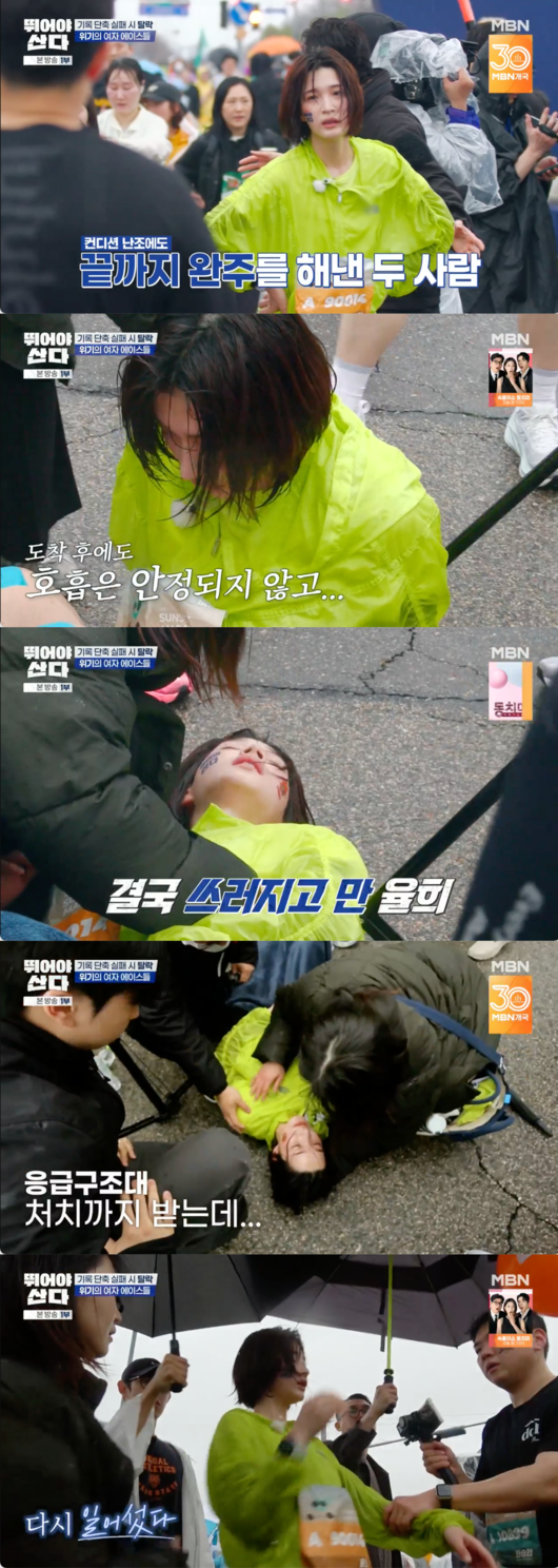 결국 완주에 성공한 율희는 도착과 함께 쓰러지고 말았다. 이어 율희는 응급구조대 처치까지 받았다. 율희는 “괜찮아요”라고 말하며 힘을 내서 바닥에서 일어났다.